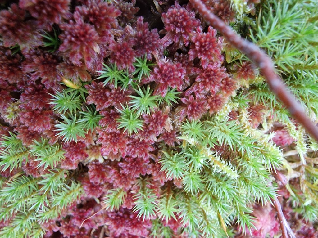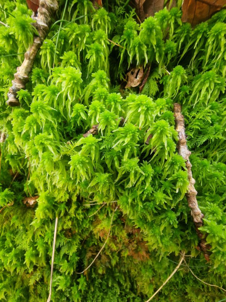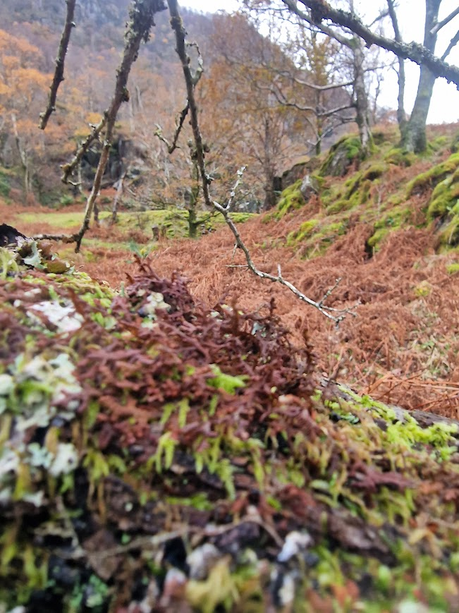 The demonstrated the difference between habitat in the south (where I live) & the north-west temperate rainforest. Sphagnum palustre in Sussex is found in bogs and wet flushes with a supply of water from springs or streams. In Borrowdale, it is also at the top of this rocky mound because it rains a lot ; in the south, it doesn’t rain enough for that.