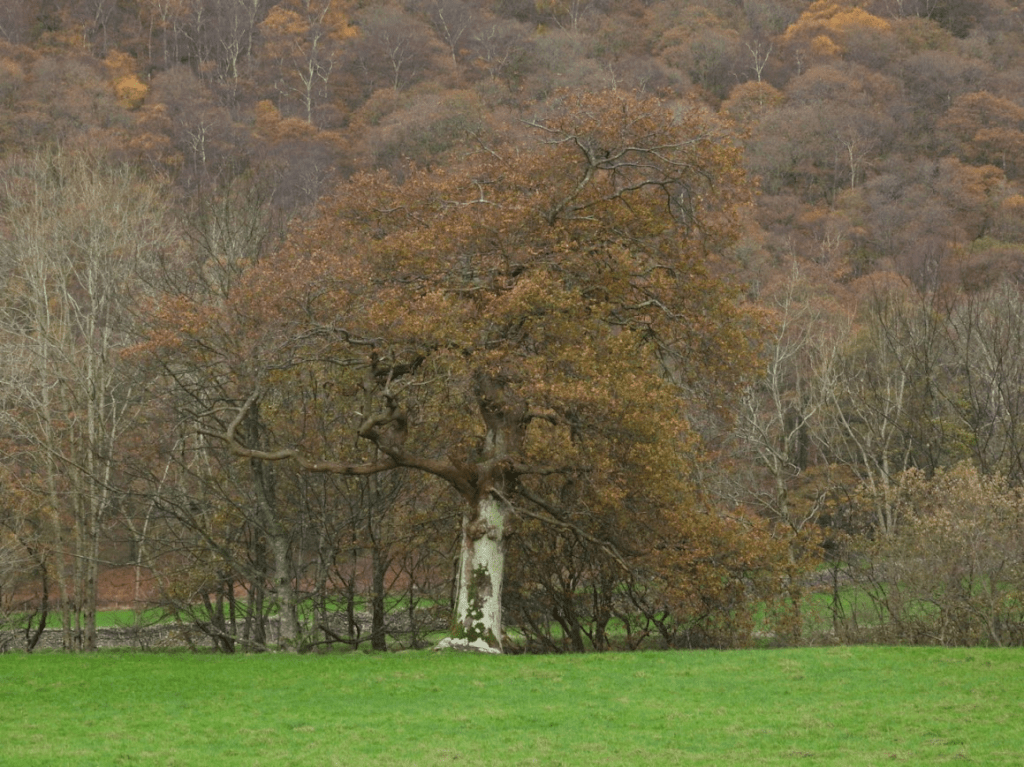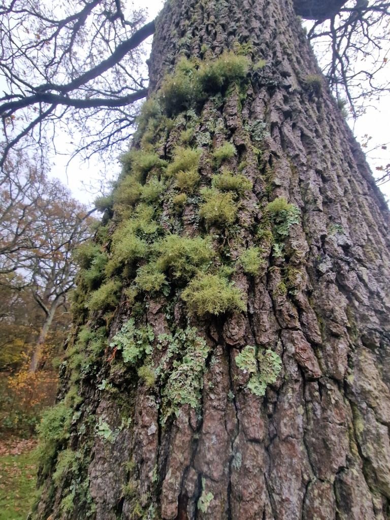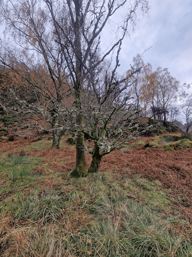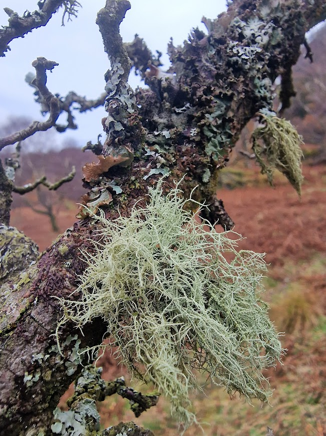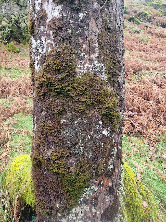 The white bark is probably lichens of the Mesic bark community (the Pertusarietum). I am very used to this community, as it is common in the south, especially in parkland trees and trees at the edge of woods. I thought it unusual to see this in the Lake District but I did some research and found that whist it is largely southern community in the UK, …. [there is] a very important stronghold in the Lake DistrictPlantlife: Lichens and Bryophytes of Atlantic Woodland in the Lake District