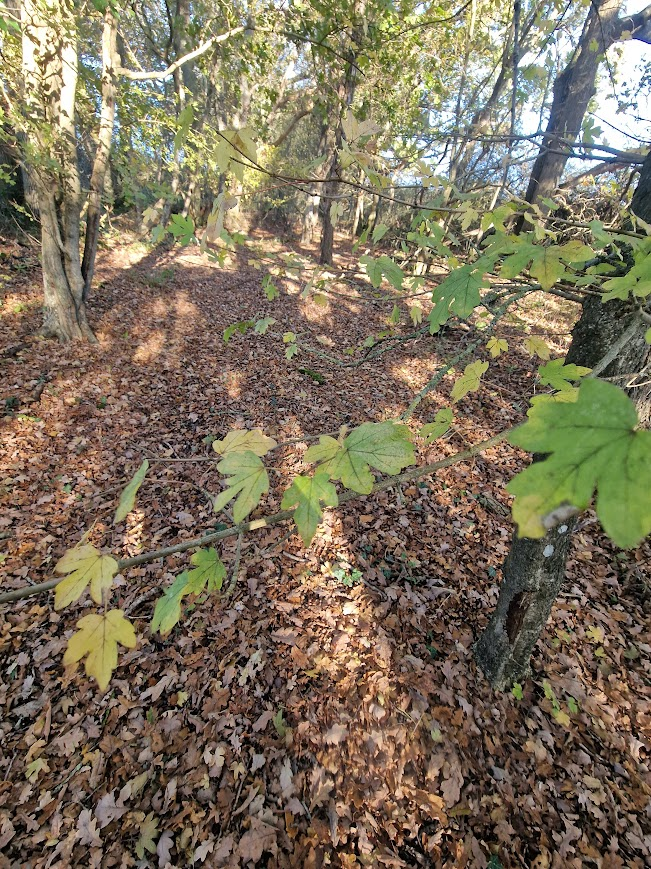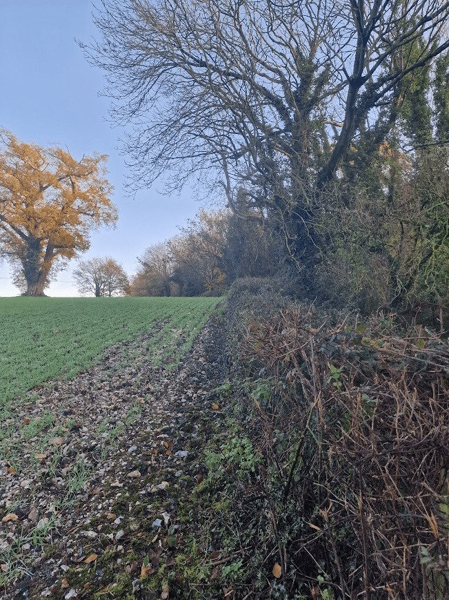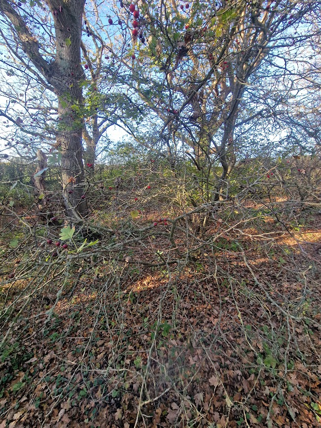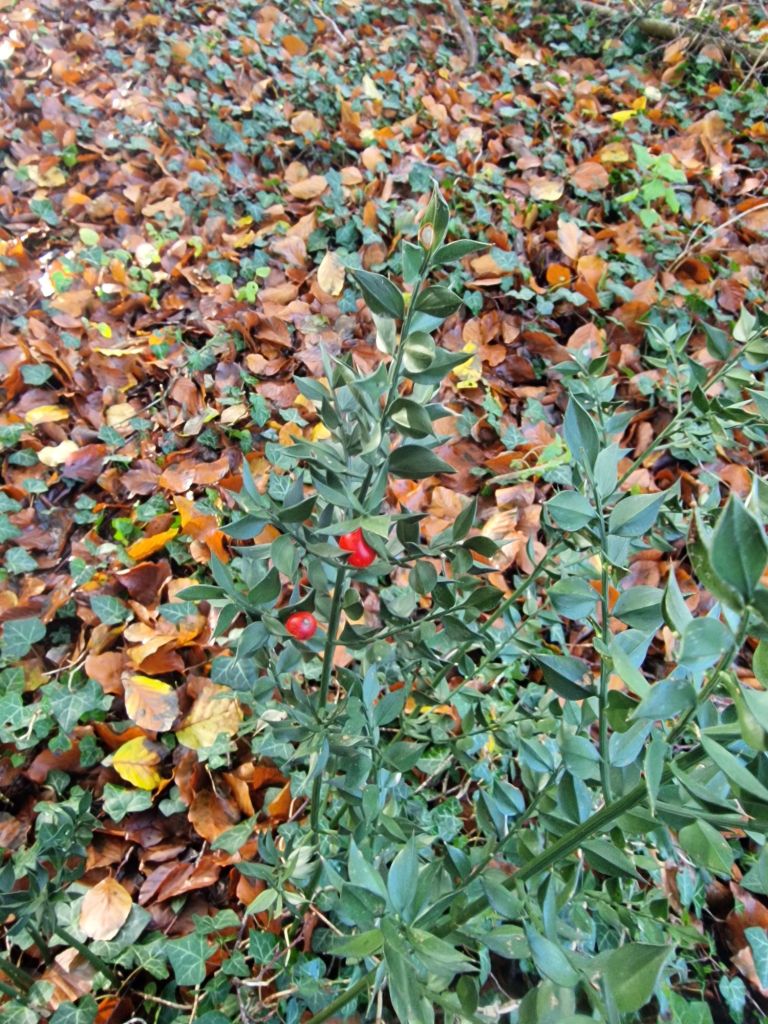 The bank and ditch of the Devil’s Ditch is continuously wooded mostly with Pedunculate Oak and Field Maple. Butcher’s Broom is an ancient woodland indicator species ; so the Devil’s Ditch has biological importance as well as historic importance,