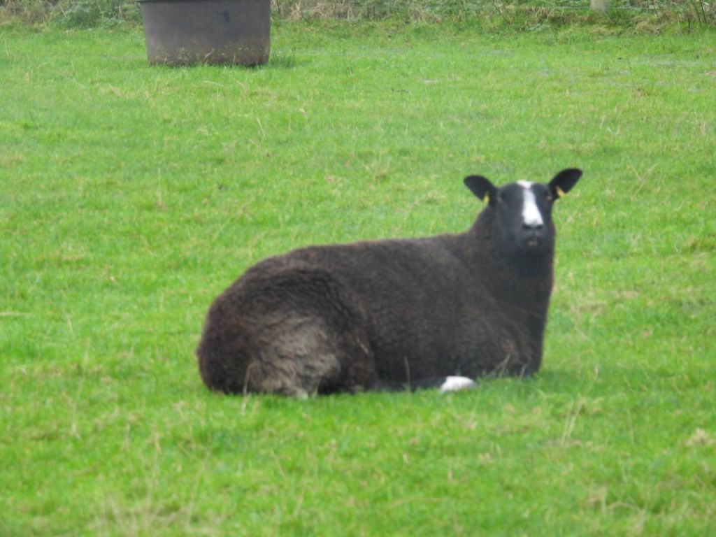 Zwartbles sheep; a breed of domestic sheep originating in the Friesland region of the north Netherlands which are popular in Scotland on the way along the road to the Wetland Centre