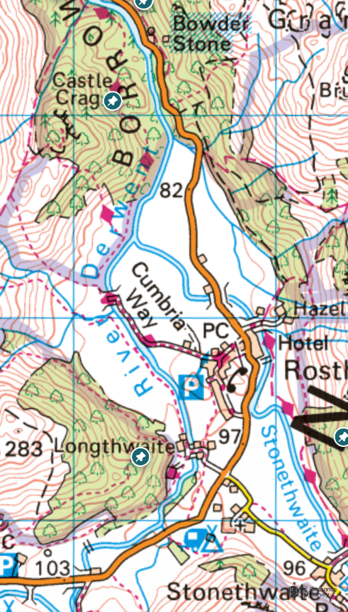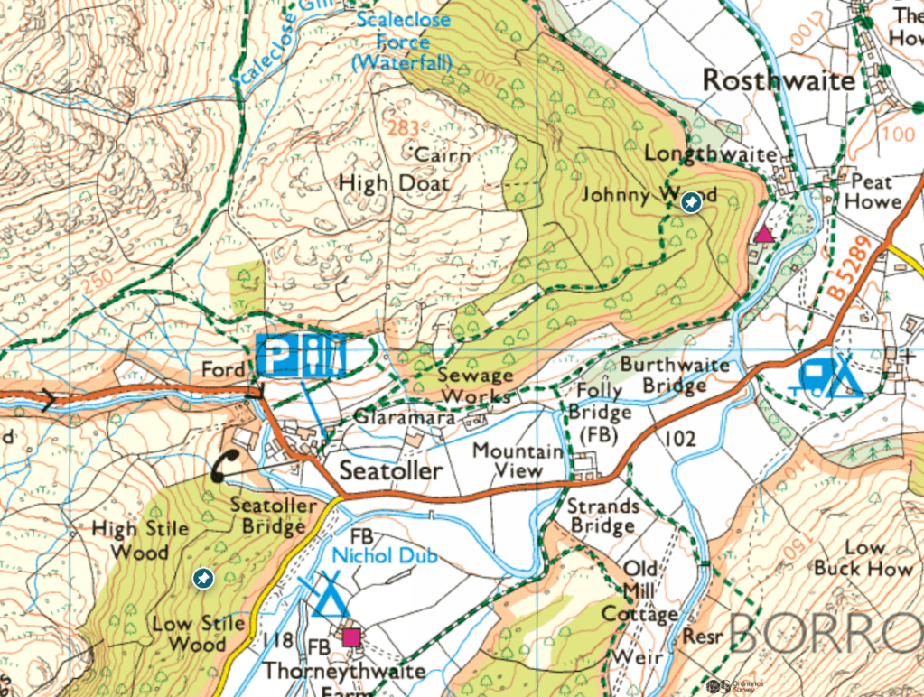 The way in and out of Cummacatta Wood is on the B2859, the Keswick to Seatoller road, along which the Stagecoach 78 bus runs