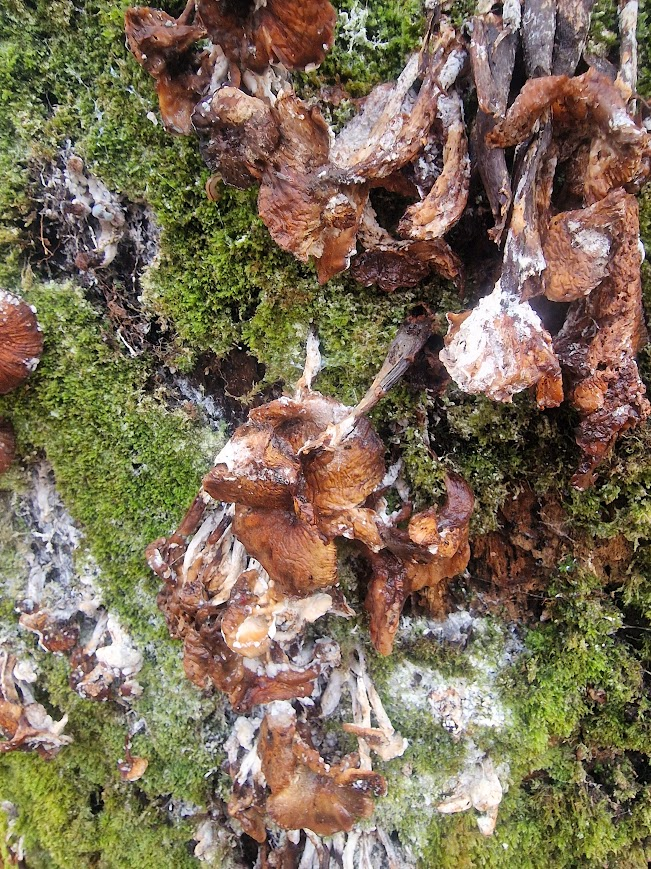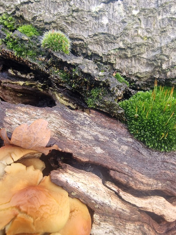 The fungus Hypholoma fasciculare and the mosses Ptychostomum capillare and Grimmia pulvinata, and unidentified lichens, on this tree’s decorticated trunk