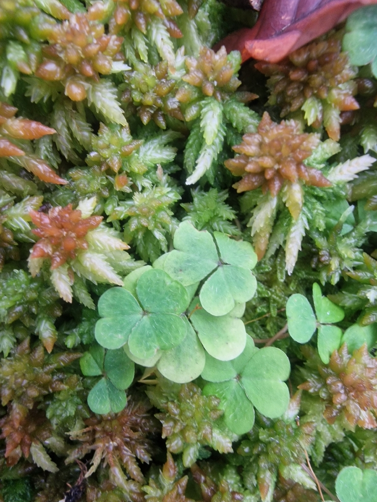 The leaves of Wood-Sorrel, an ancient woodland indicator species, growing though Sphagnum palustre