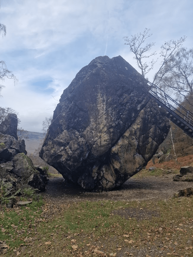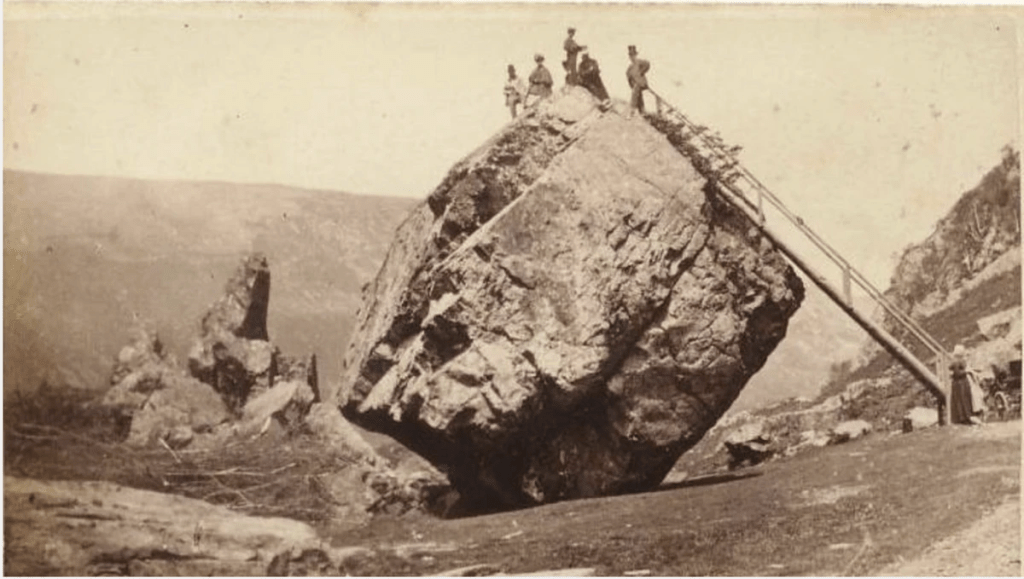 Two hundred years ago, the Bowder Stone was one of the most prominent landmarks in the valley – a huge boulder that awed visitors with its sheer size and mass that stood out against the sky as the road wound towards it .Balanced improbably on one edge, it was popular with Georgian tourists for the ‘pleasurable terror’; they enjoyed wild, romantic scenery and the frisson of experiencing danger from a safe distance.National Trust History on the Borrowdale Valley