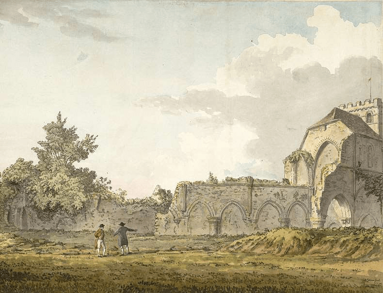 Below, a watercolour view of the ruins of the nave of Boxgrove Priory, seen from the churchyard, by Samuel Hieronymous Grimm, 1781