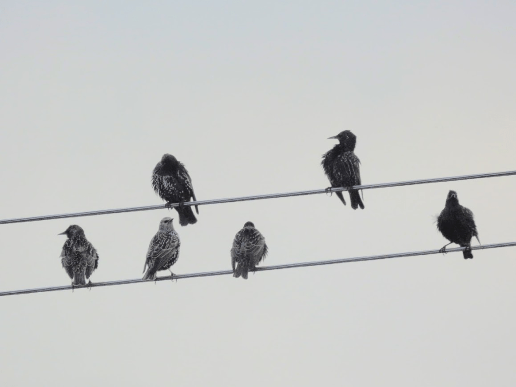 Starlings, Sturnus vulgaris, on a power line; walking back towards the bus stop.