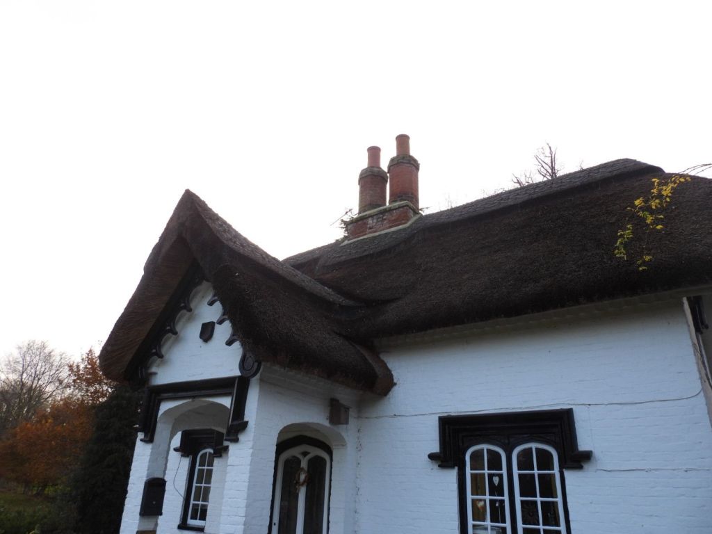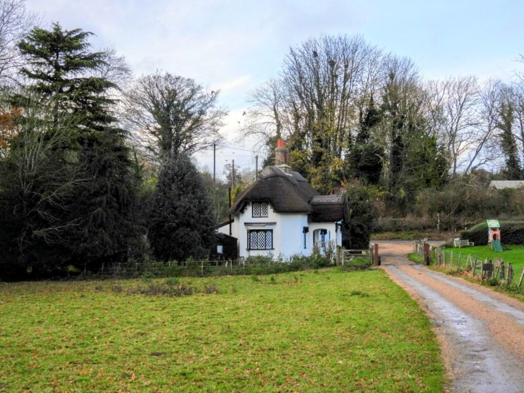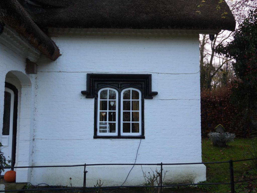 Historic England listing: Lodge to Fredville Park 11.10.63 II Gate lodge. Early C19. Painted brick with thatched roof. One storey and garret on plinth with dogtooth cornice to half-hipped roof with pierced bargeboards. Central stack with double polygonal flues. Single storey gabled porch with elliptical openings on all 3 sides, that to front with label hood. Arched 2 light wooden casements with label hoods either side of porch, with central four centred arched door with Gothick tracery. Canted bay with Gothick windows on left return front