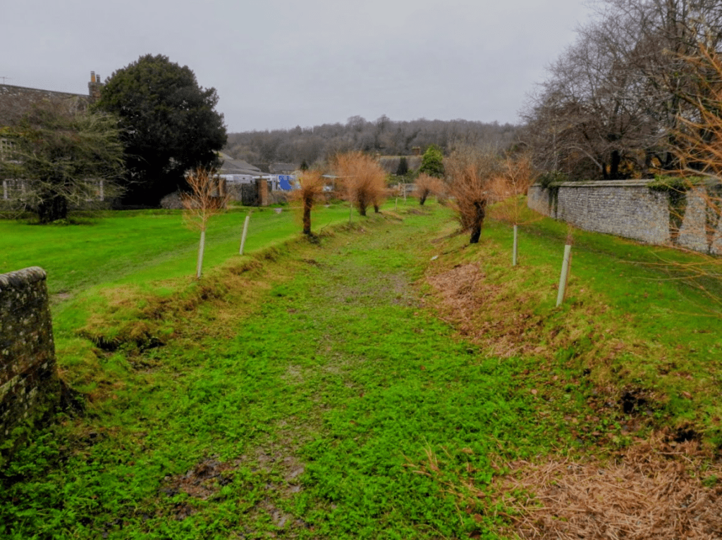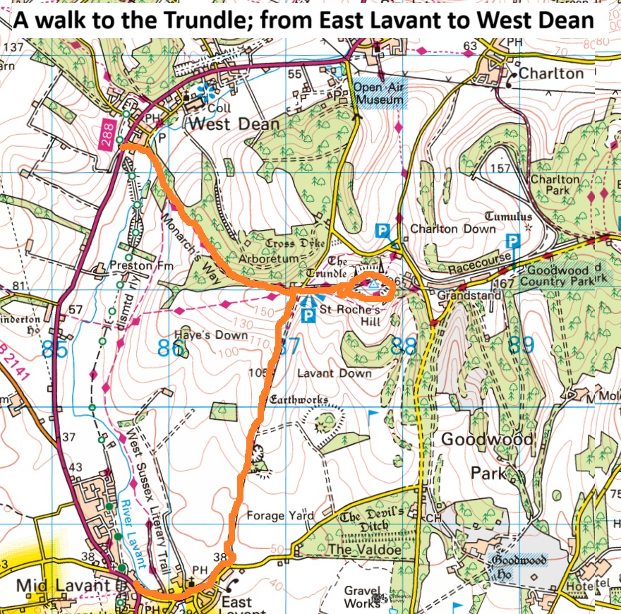 The River Lavant is a chalk stream winterbourne (a river that is dry during the summer months). It rises from a spring at East Dean and flows to Chichester. From east of Chichester its natural course was south to the sea at Pagham, but the Romans diverted it to flow around the southern walls of Chichester. Currently there is no water in it, there should be, as the draught from February to October of this year has lowered the water level in the chalk aquifer,