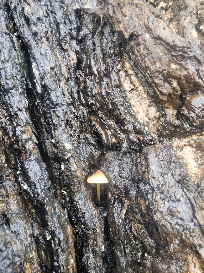 A Mycena sp. mushroom on the bark of one og these chestnuts
