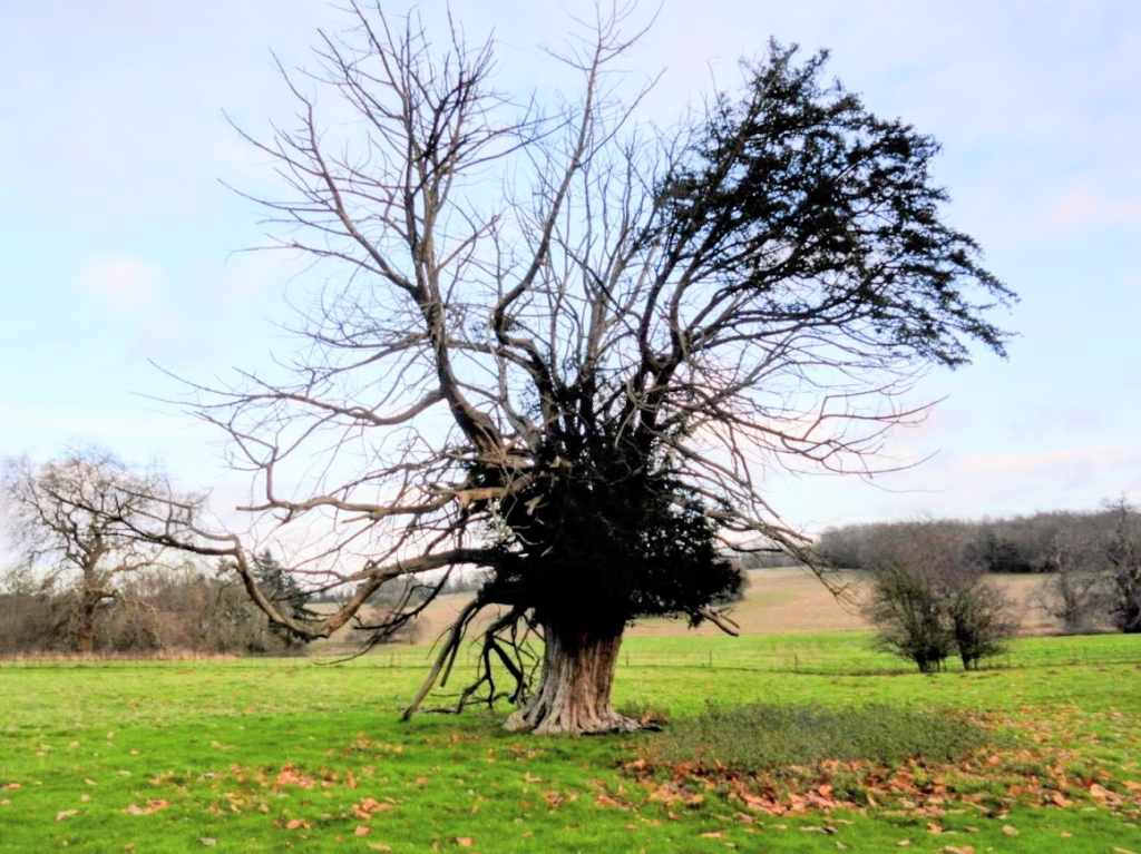 Hard to identify this as an ancient Yew, Taxus baccata, at first. It’s shape is nothing like the Yews of its native strongholds: chalk scarp-face woodland. It’s a pasture woodland Yew, sculpted by nibbling deer. Deer can tolerate Yew.