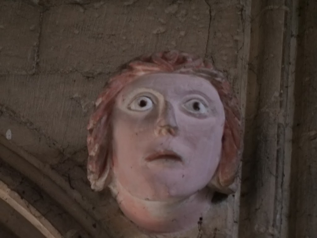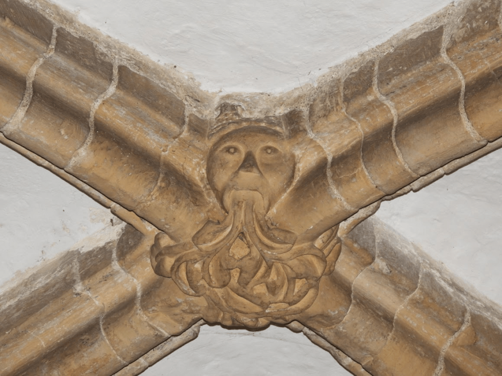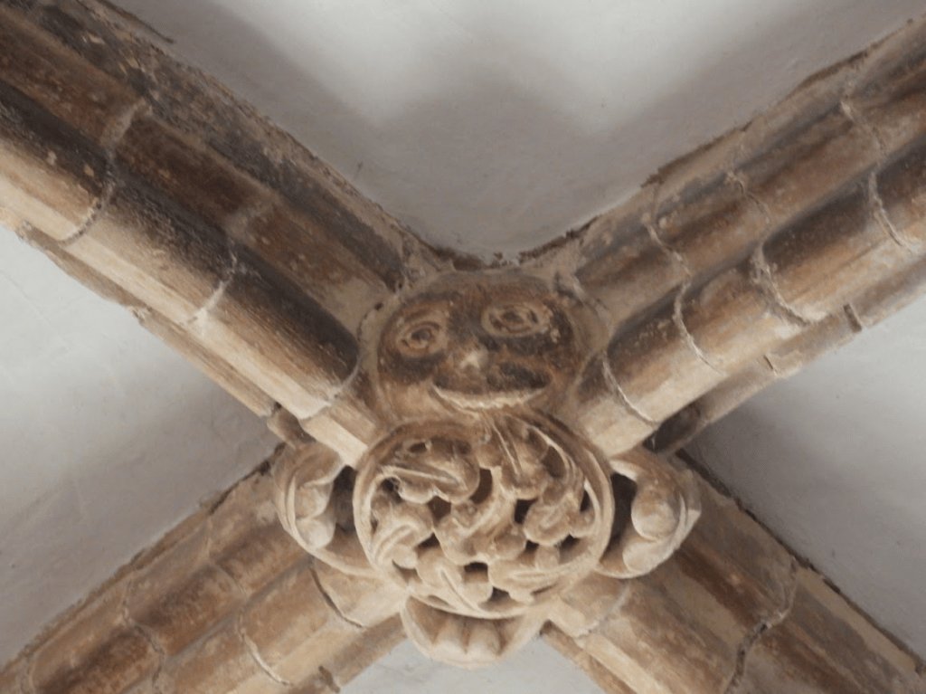 Two of the bosses of the ribbed vault of the south aisle of the nave are decorated with foliated head (often called Green Men)