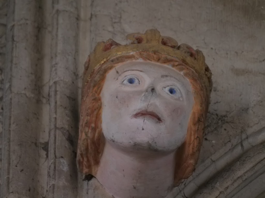 Sussex carved stone representations of foliage in C12 and early C13 Shoreham seem quite primitive compared with Byzantine mosaics of foliage in C12 Athens; but this is not an entirely fair judgement; mosaics partially look more sophisticated because they are made of brightly coloured glass and carved stone is grey; but it is only grey now because its original painting has been lost. In C12 and C13 churches, sculptures would have been painted in bright colours, see Tysoe Heritage Research Group. The recently repainted corbel heads in Boxgrove Priory Church, West Sussex nr. Chichester, give an impression of how colourful Sussex churches may have looked in Norman, Plantagenet and Tudor times, before Henry VIII’s reformation