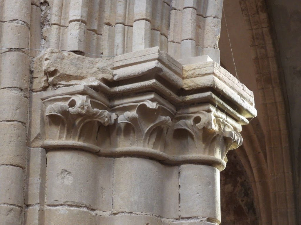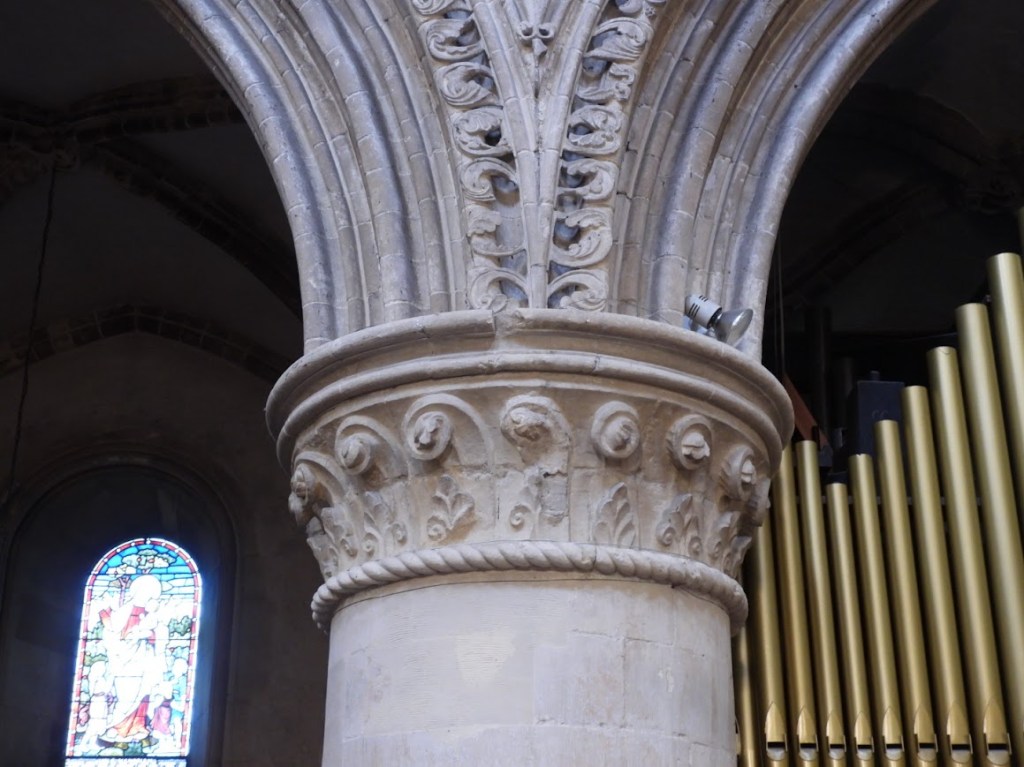 Foliate capitals of the quadripartite pillars supporting the cross of the choir, aisle and transects; thick so they can old up the tower above. Highly complex foliate forms made possible by the function of pillars: weight bearing.