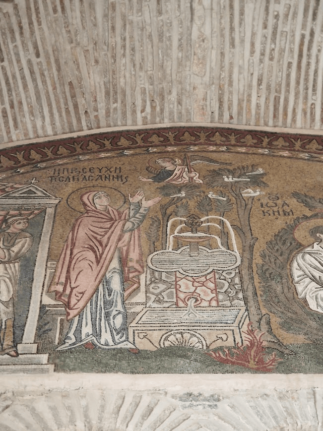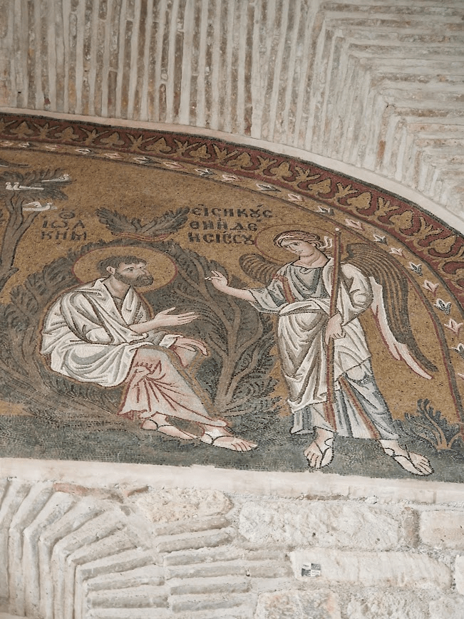My interest in how landscape and botany are represented in medieval churches was engendered by taking a module on Byzantine art during studying for an MA in History of Art at the University of Sussex, 2003-2005. This module was not about landscape or botany; it was about the iconology of Byzantine art and production techniques, particularly mosaics, but because I was always always interested in landscape (I did A levels in Geology and Geography as well as Music, and spent a lot of time walking round the countryside of Sussex on A level field trips, and walking on the Downs at weekends with my Grandfather, an agricultural labourer on a farm in Rottingdean). I ploughed a lonely furrow researching the representation of gardens and wildernesses in the 1316-1321 mosaics of the Annunciations to St Anna and St Joachim in the narthex (entrance area) in the Church of the Chora Monastery, as when I took my MA, little research on landscape in Byzantine mosaics has been undertaken. The Chora Monastery is in Constantinople (now Istanbul). The Annunciation to St Anna and St Joachim is part of the cycle of representations of the life of the Theotokos (mother of god) and life of Christ that appears in all Byzantine (Greek Orthodox) churches. This scene is not typically depicted in western art, as its story derives from the apocryphal Protoevangelion of James, i.e. a text not accepted as canonical in western Christianity. In Byzantine iconology, Joachim is always presented in a wilderness (dessert) and Anna is shown in walled garden (a symbols of virginity in Medieval art).