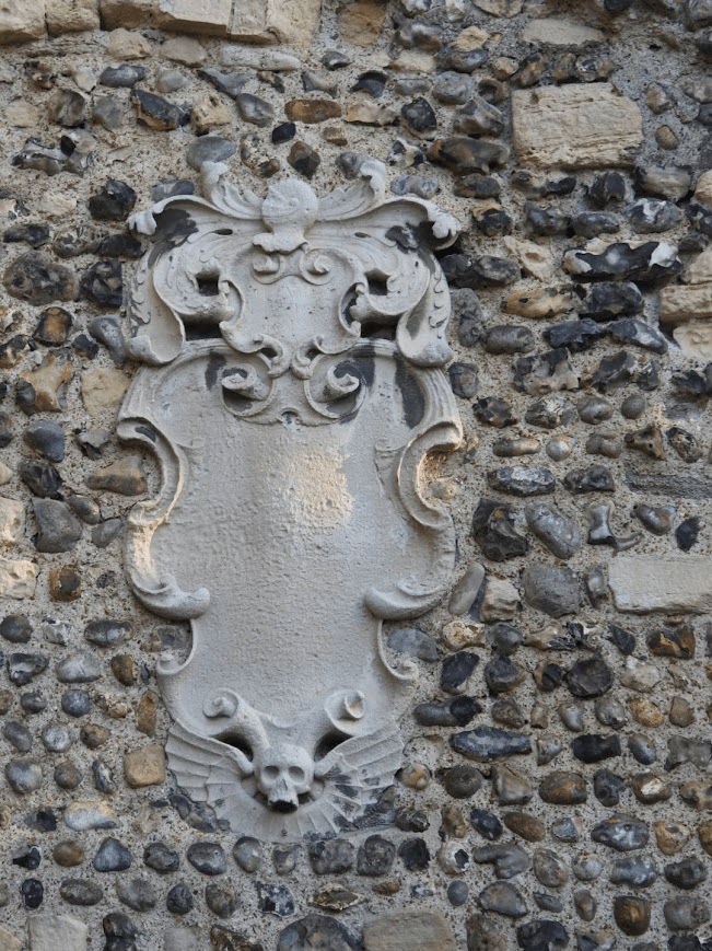 Whist foliage in the broadest sense symbolises life, in contrast, a memorial plaque (cartouche), on the west exterior wall of the church, signifies bodily death. The name of the person memorialised has eroded away by the salty westerly winds of the Channel. But its baroque style and the helmet suggest that this is a memorial to a now unknown C18 peer of the realm