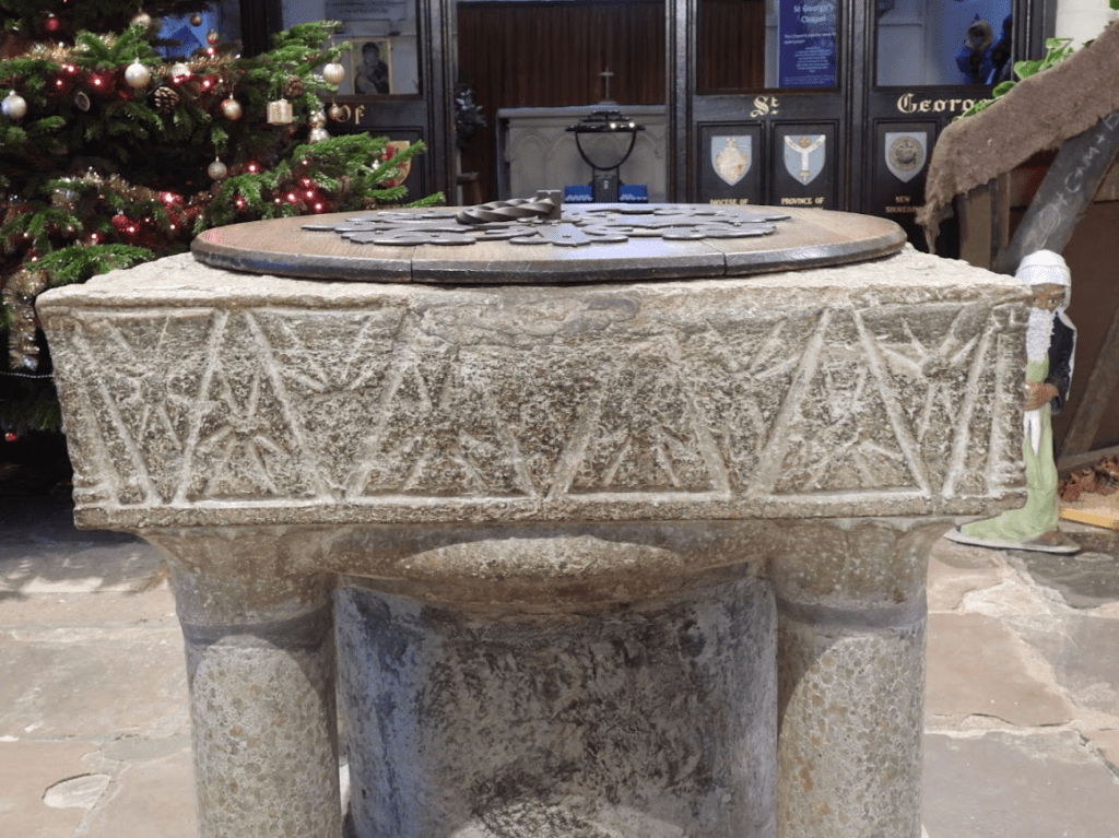 The south side of the Norman font depicts stars, another aspect of the natural world. English Romanesque, Norman, architecture and art is known for its robust construction and distinctive ornamentation, including geometric patterns like the zigzag (chevron) and stars or rosettes.