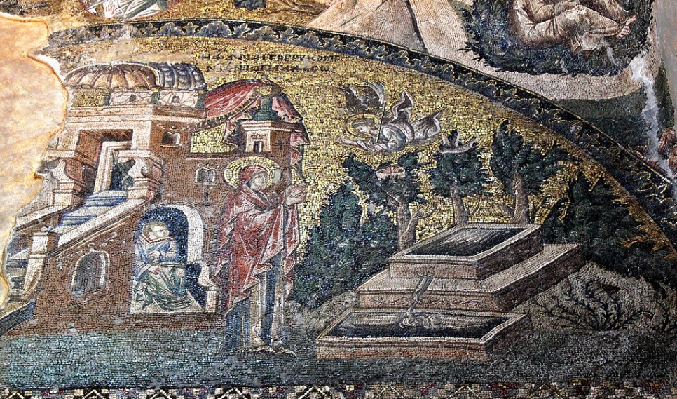 The Church of the Chora Monastery is renowned … for its well-preserved mosaics and frescoes. It presents important and beautiful examples of East Roman painting [and mosaics] in its last period [the Palaiologoi dynasty, 1259 to 1453]. … The name “Kariye” (Turkish …: village) originated from an ancient Greek word “Chora“ (χώρα) [which] means “in the fields” or “in the countryside” because the old church and monastery remained outside the walls of Constantinople. [The] Theodosian walls [were] built in 408-450. [T]he fact that the word Chora is written along with the names of both of them on the mosaics depicting Jesus and Mary inside the church shows that it has a mystical meaning too. [The] Chora Church was originally built in the early 4th century as part of a monastery complex … during the reign of Emperor Iustinianos [Justinian] in the 5th century. Kariye Mosque retrieved 03.01.26.