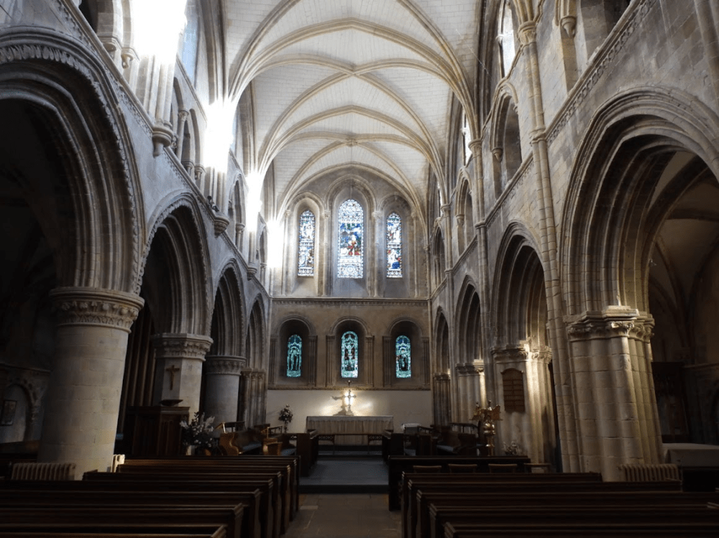 The quadripartite aisle vaults, with roll-moulded ribs and small foliage-bosses (including three with a green man in the south aisle), may have been complete before the upper parts [of the church] were started. … The triple shafts on the outer walls, with stiff leaf capitals, also look late C12 and are closest to the lower parts of the arcades. The stiff leaf capitals on the alternating round and octagonal piers of the north arcade, with an outer order of foliage, recall Canterbury. Either they were the work of masons from there or there was influence from Chichester, where Canterbury masons are known to have worked… The mouldings of the pointed arches are finer than those of the south arcade, where the piers have clustered shafts, each with a stiff leaf capital. The innermost ones rise to the vault and, as the date differs little from the north arcade, despite the differences, are further confirmation that a vault was intended from the start.