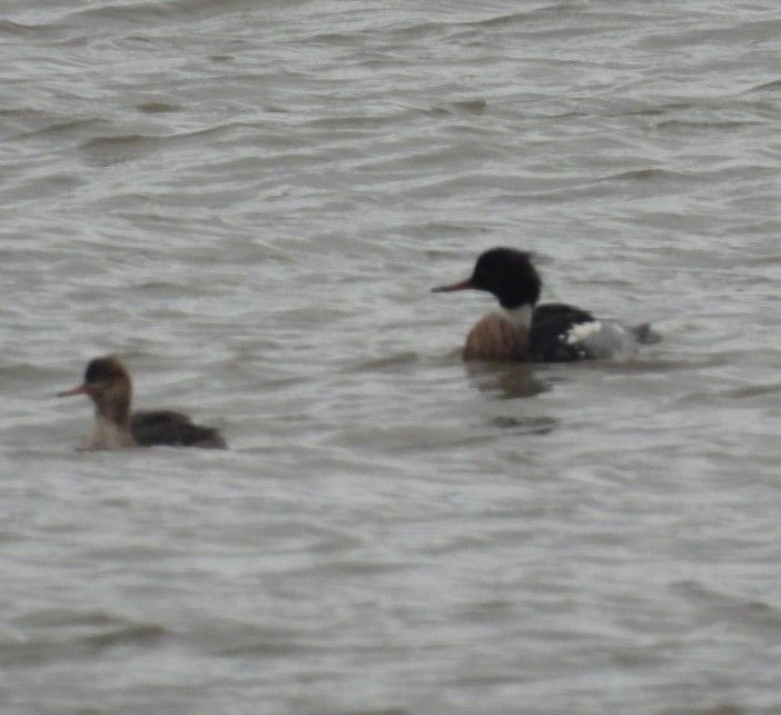 Peeking through the trees, I saw two Red-Breated Mergansers