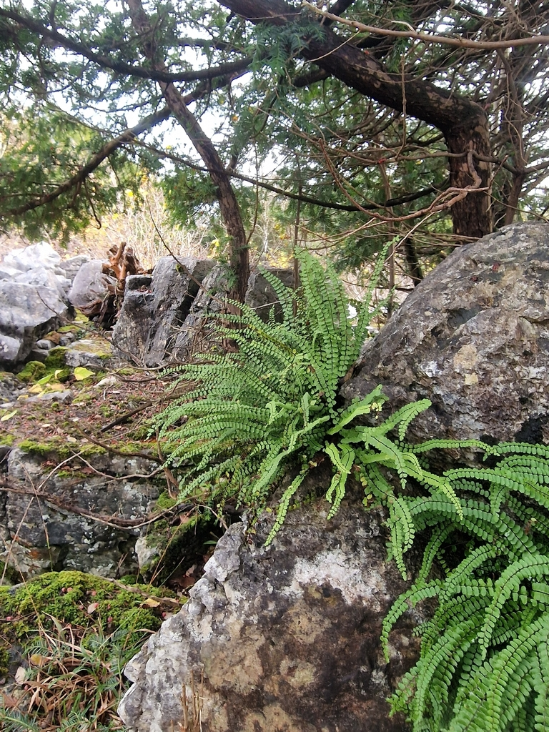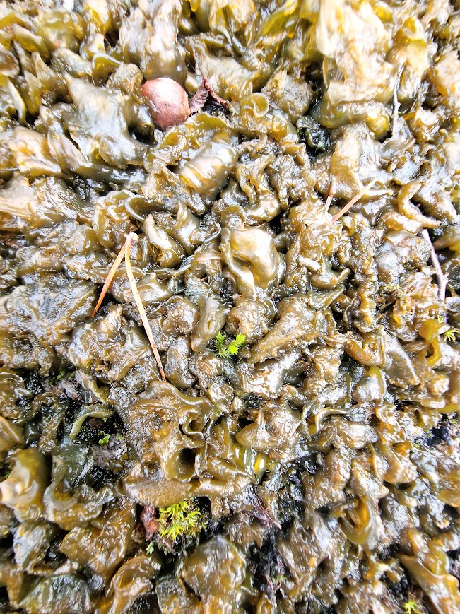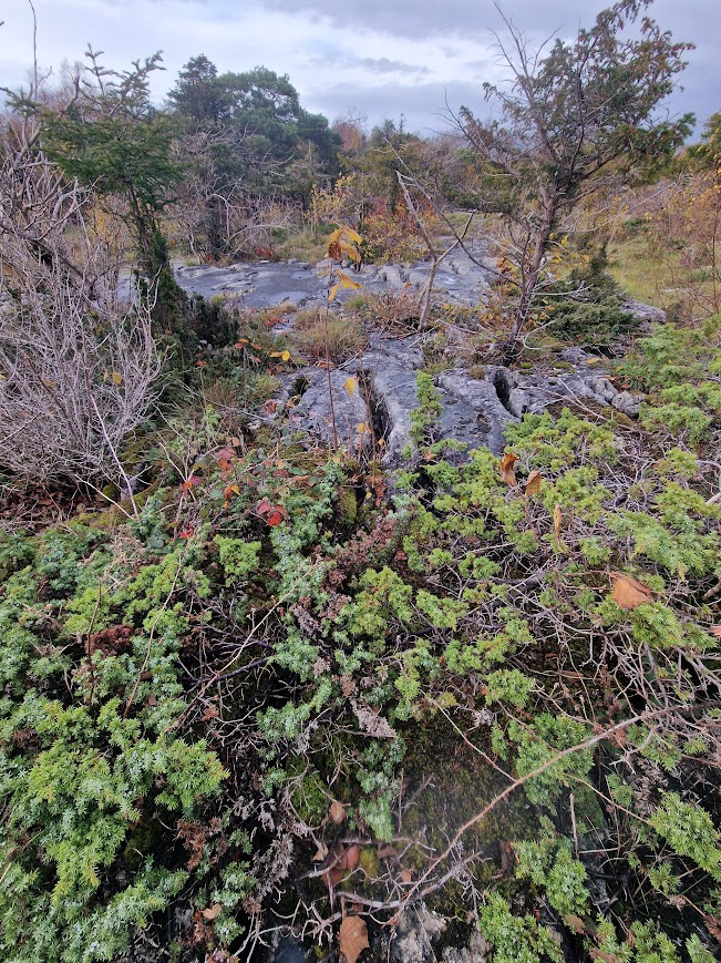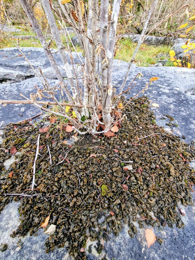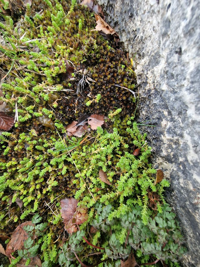 There was lots of Nostoc commune; a cyanobacteria (blue-green algae), concentrated into brownish or greenish clumps, on the limestone pavement aften around vascular plants