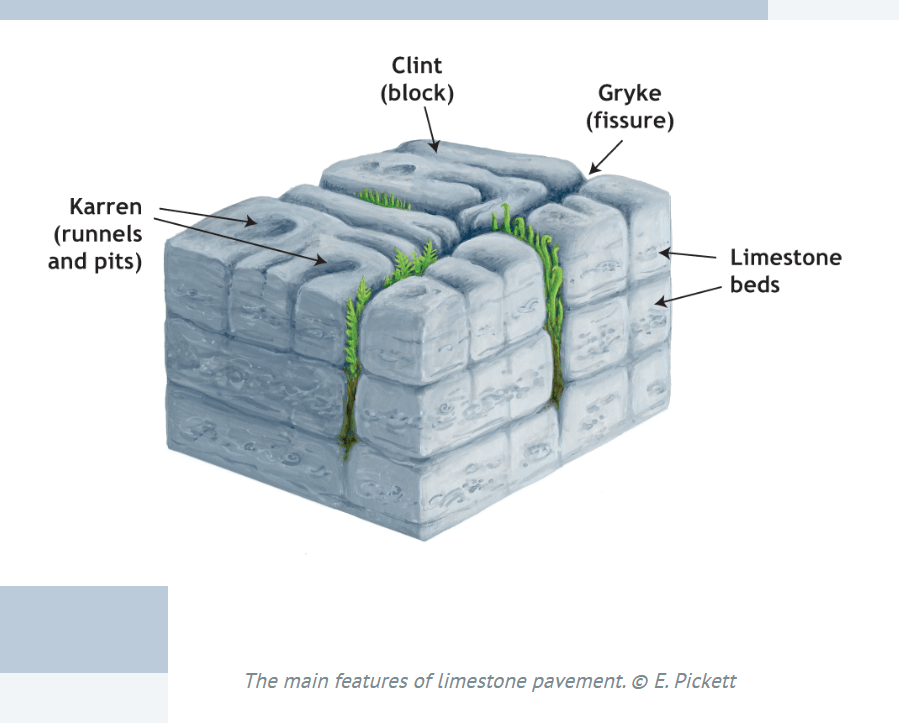 On the open pavements you will see wide flat blocks called clints, separated by deep fissures known as grikes. Lying on the clint surfaces are shallow gutter-like runnels and pan-like solution cups, which collect and funnel rainwater from the rock surface.Nature England Gait Barrows National Nature Reserve