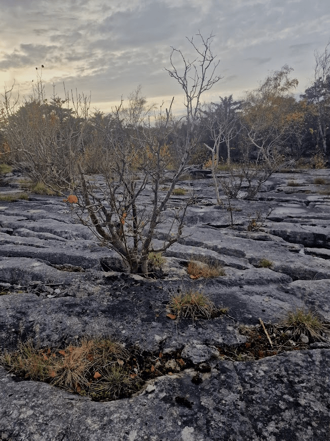 A Yew. Limestone pavement produces stunted trees due to the paucity of soil in the grykes
