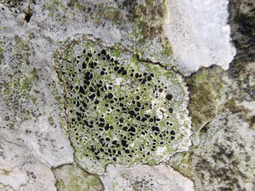 Tephromella atra with free-living aga living on the thallus. Not especially maritime, … but also rather common in the aerohaline zone [the above the area reached by direct wave action.] Lichens Marines