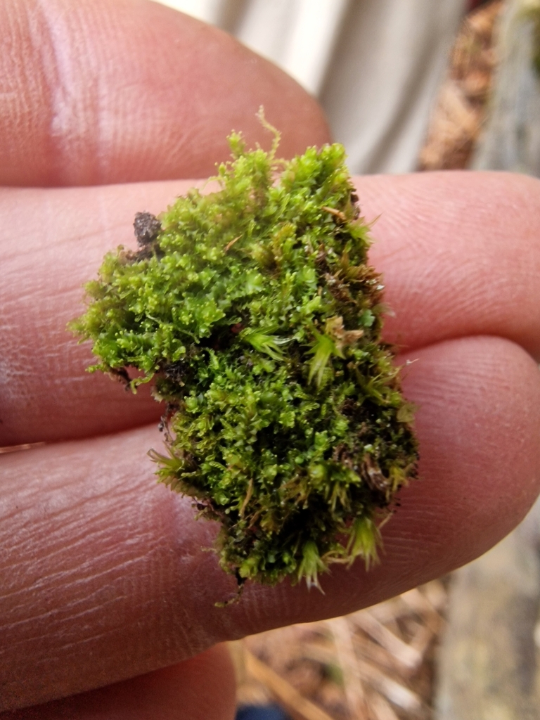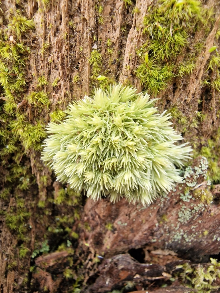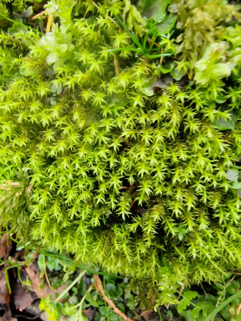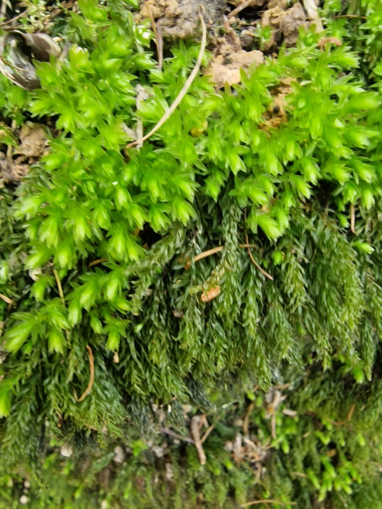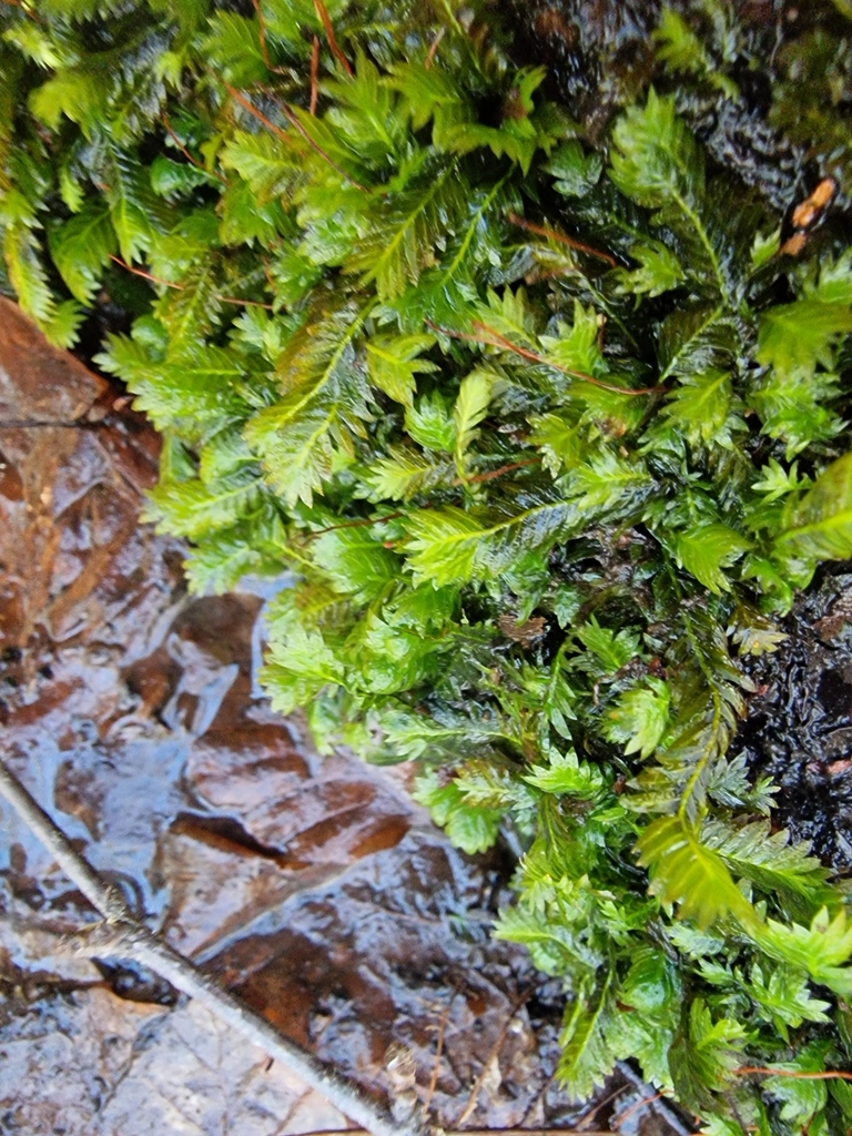 The demonstrated the difference between habitat in the south (where I live) & the north-west temperate rainforest. Sphagnum palustre in Sussex is found in bogs and wet flushes with a supply of water from springs or streams. In Borrowdale, it is also at the top of this rocky mound because it rains a lot ; in the south, it doesn’t rain enough for that.