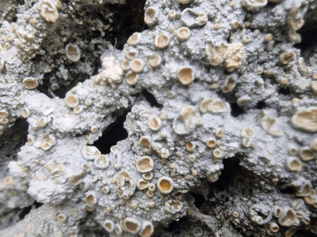 Rhizocarpon geographicum (green and black) in a mosaic with Lecidea lithophila (white thallus with red tinge and black apothecia) and an other lichen