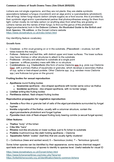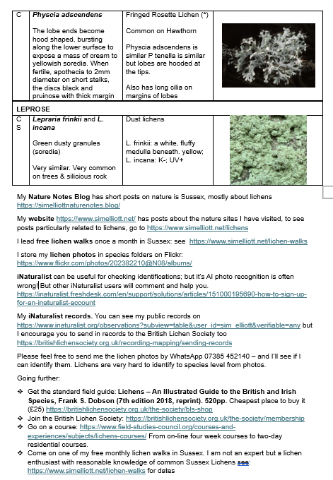 I often lead introduction to lichen walks – either for community nature organisations; the Lost Woods of the Low Weald and South Downs (Woodland Trust); Changing Chalk (National Trust and Lewes Railway Land Wildlife Trust) or RSPB Pagham Harbour, or my own free lichen walks, see: Lichen Walks