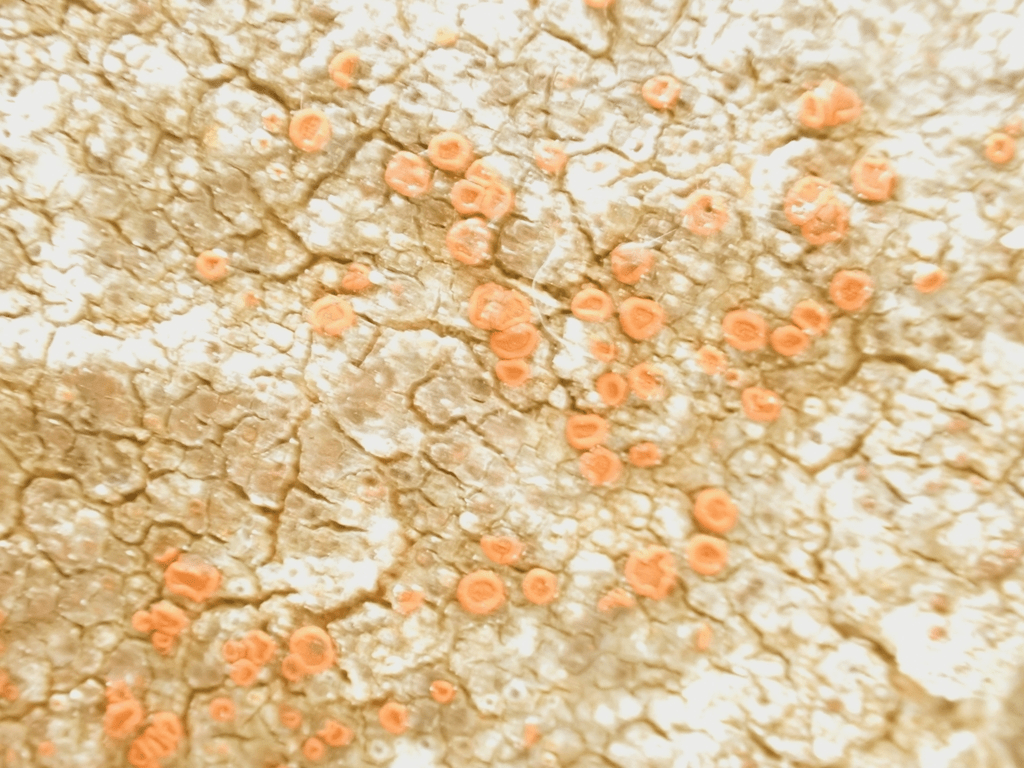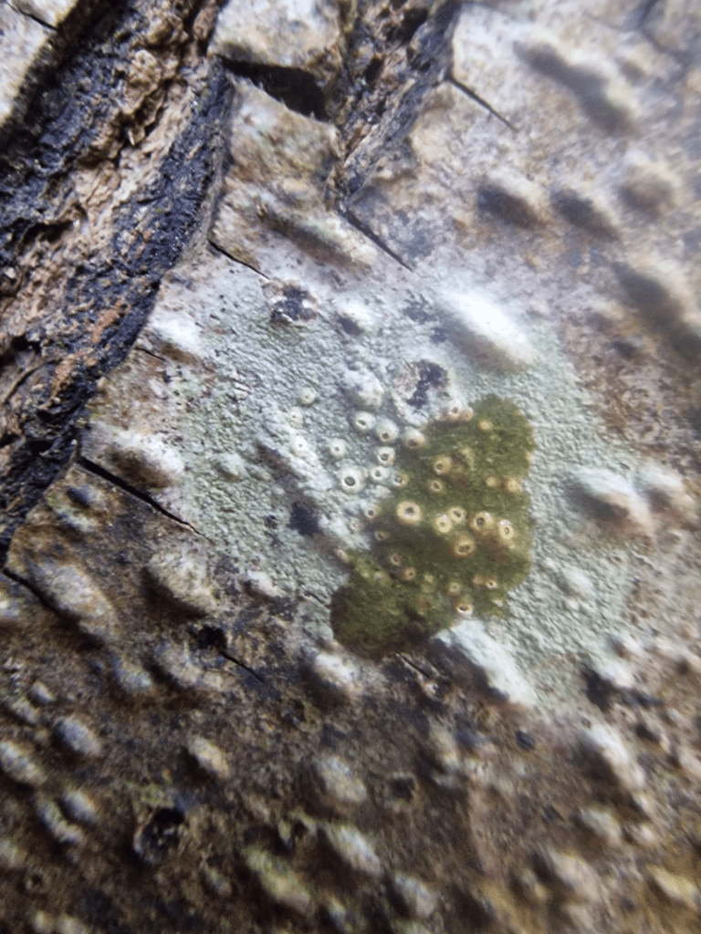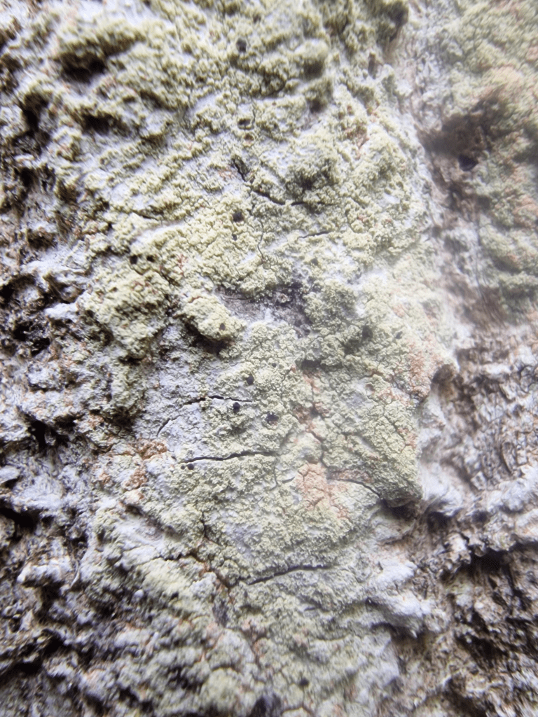 Pertusaria flavida; the orange part of this photo, which can only be identified (by turning orange) with UV light and/or a chemical spot reagent test, which reacts to lichen substances (mostly secondary metabolites). I did both the UV and the reagebts tests in the filed