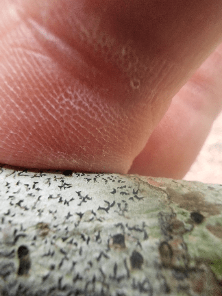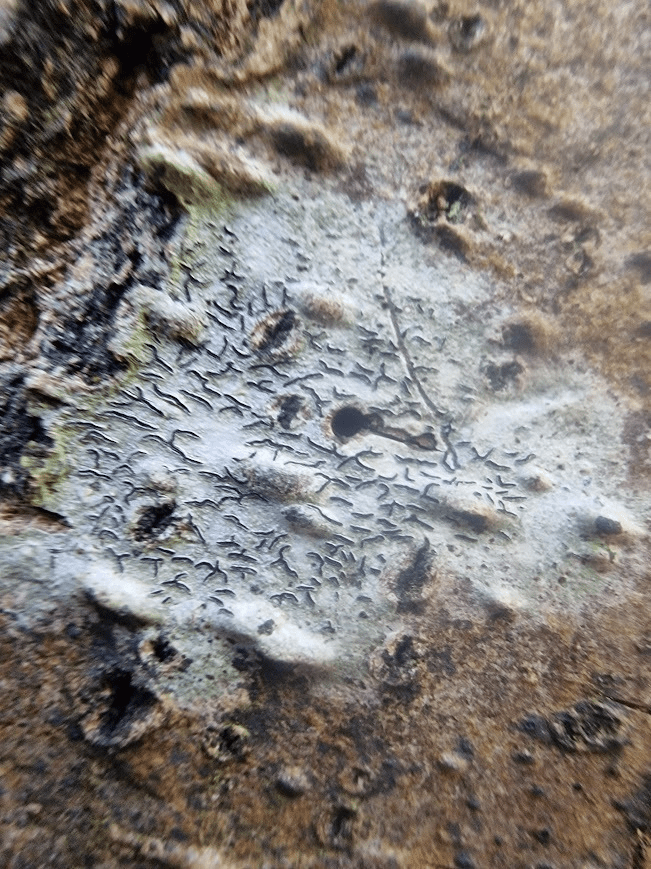 Pertusaria sp. surrounded by Graphis scripta sensu lato. The revision of the Graphidaceae lichens in the Lichens of Great Britain and Ireland III has split Graphis scripta into more than one species, and spore microscopy is required for definitive identification of Graphidaceae lichen