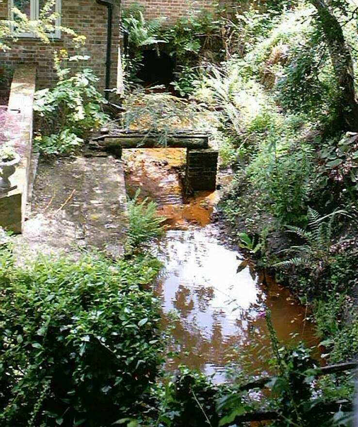 Part of the forge pond survives just to the west by a road on private land at 684161, with a modern weir. Looking down east from the bridge here, a rusty channel can clearly be seen far below, running under the conservatory of Forge Cottage. Hammer Ponds: Ashburnham Forge