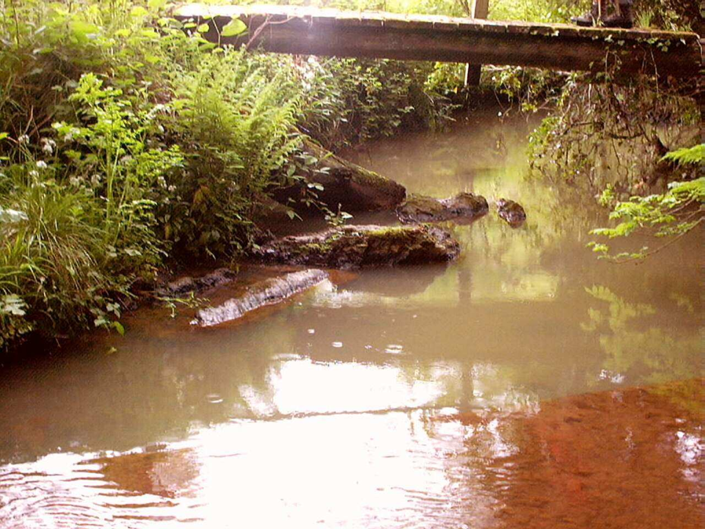 North along the track down a detour right at the path fork (685172) there is a footbridge over a rusty ford with several large reddish ‘bears’ in the stream: a bear is a rock of imperfectly smelted ore and iron. Slightly further along, left in a private meadow, a high bank is visible. This is the old furnace bay, and the furnace pond, now dry, lay beyond it. This is now a low field. The old spillway is roughly halfway along the bay and still serves a stream – depending on the overgrowth, this may be seen as well as heard. Hammer Ponds: Ashburnham Forge