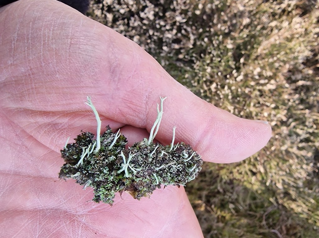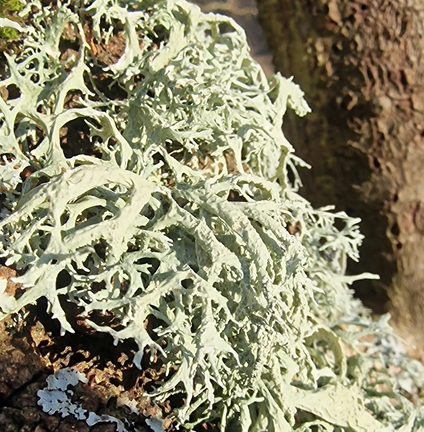 Hawthorns; as in Sussex, often have abundant (bit different) lichen. Sussex Hawthorns are dominated by Ranalina spp. lichens with few or no Usnea spp. Upland north-west Hawthorn often have more Usnea. On these hawthorns Usnea floridana is relatively common; it is very rare on South East hawthorns