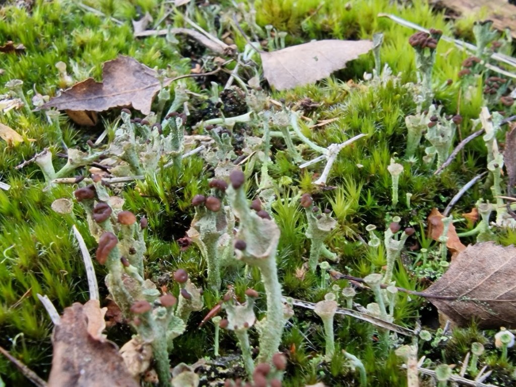 Probably Cladonia polydactyla, with bright red apothecia (fruiting bodies) on the edges of its cups; growing with/on moss